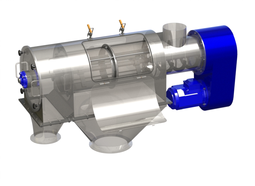 Las partículas gruesas se desplazan por la parte interior del tamiz hasta su expulsion por la tolva de rechazo, mientras que las partículas finas y aptas según el tamiz instalado son expulsadas por la tolva de central de la máquina.