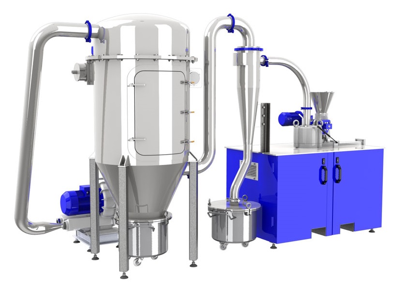 Instalación especialmente diseñada según normas “GMP” para la molienda de productos farmacéuticos, alimenticios, químicos, etc.